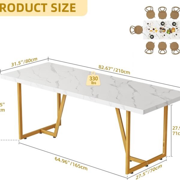 82.6” Large Modern Dining Table for 8-10 People, Rectangular White Kitchen Dining Room Table with Faux Marble Tabletop and Geometric Gold Metal Legs, Wood Dinner Tables for Family Gathering
