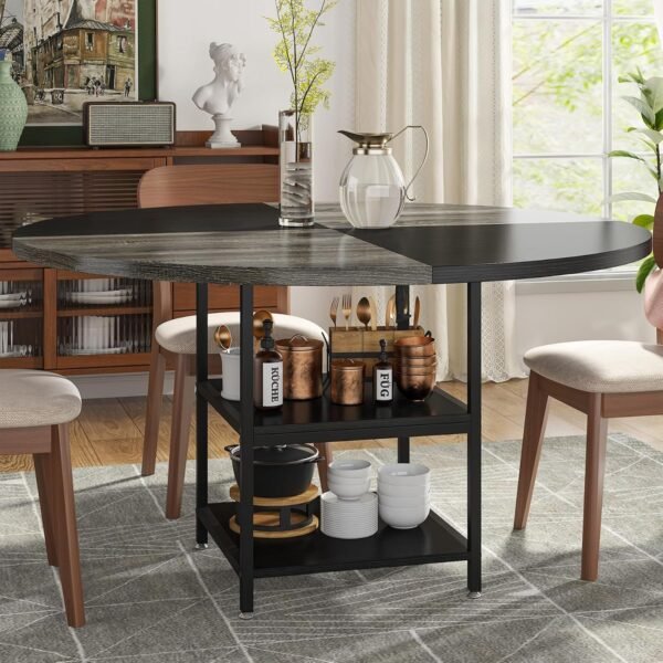 47 inch Round Dining Table for 4, Wood Kitchen Table Large Dinner Table with Storage Shelf Metal Legs for Home Dining Room Living Room, Black Rustic Grey(Only Table)