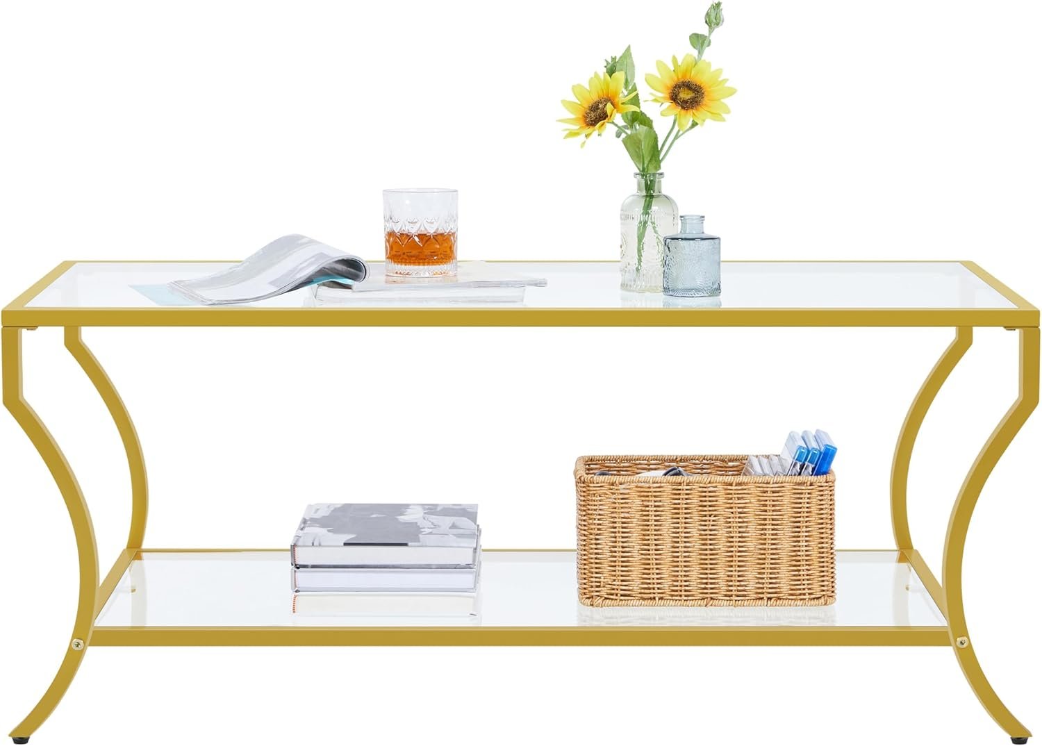 Gold Coffee Table, 2-Tier Rectangular Glass Coffee Table with Curved Frame, Modern Center Table for Living Room & Apartment, Easy Assembly