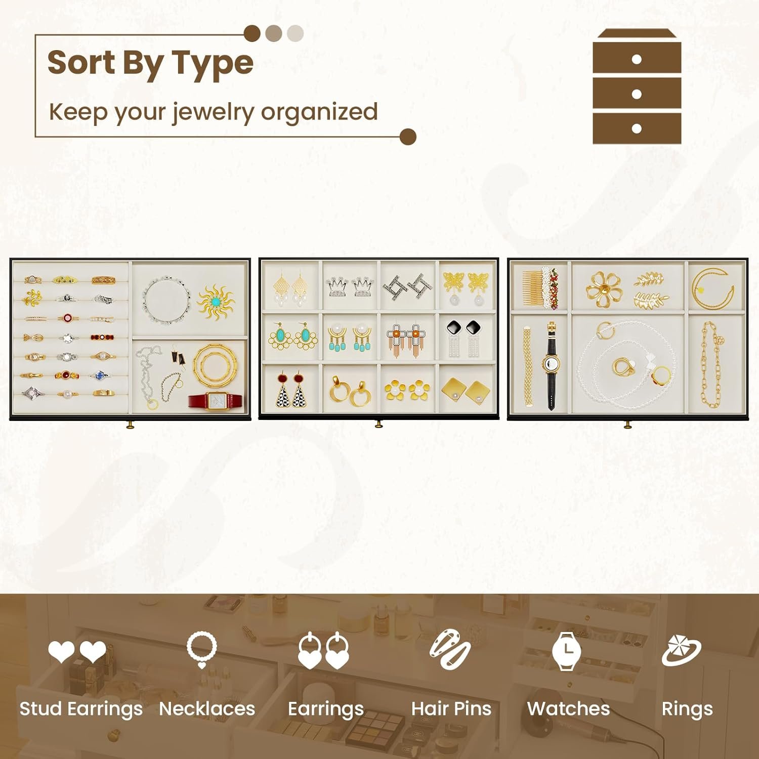 - 【Makeup Vanity with Jewelry Organizer】This vanity desk features a jewelry case with 3 layers. Keep all your jewelry organized—rings, earrings & bracelaces go in the various slots of the top layer, and necklaces, sunglasses and watches go in the 2 bottom layers.